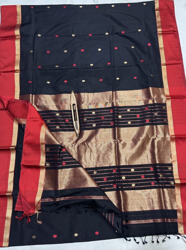 The weaving process involves fine silk warp and weft, ensuring durability, luxurious touch, and rich texture. The handloom weaving technique keeps the authenticity intact, unlike machine-made imitations.