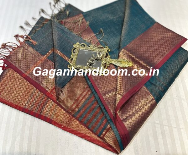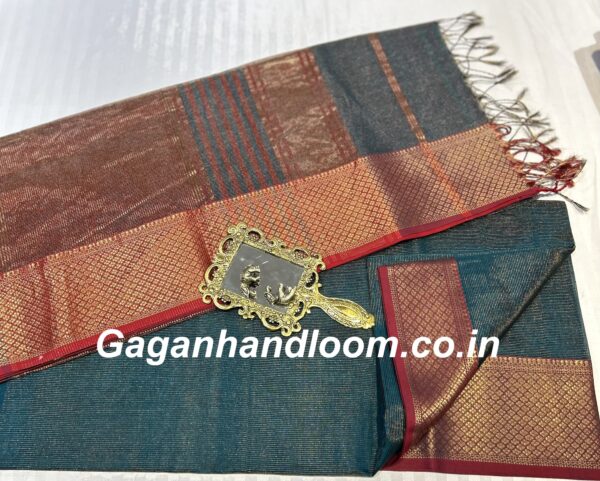 The shimmering tissue texture adds a regal charm while maintaining the comfort of handloom cotton. Ideal for weddings, celebrations, and festive occasions — this saree complements both traditional and modern looks.